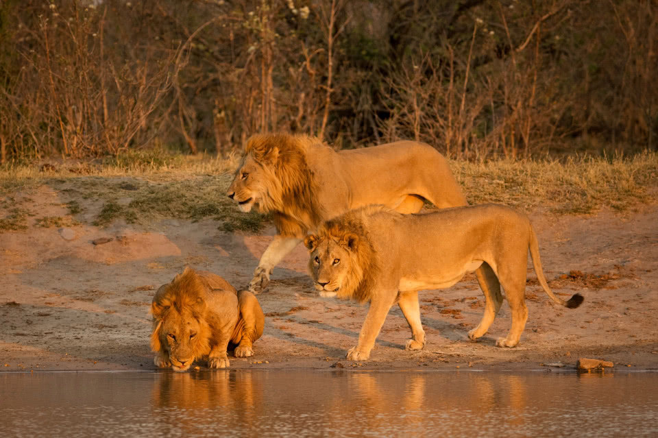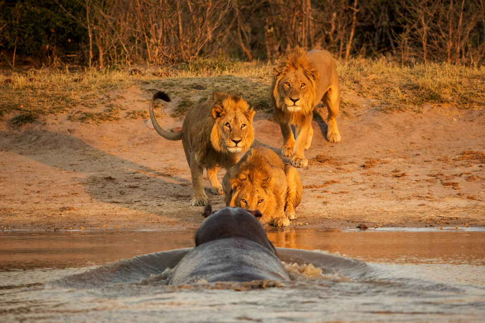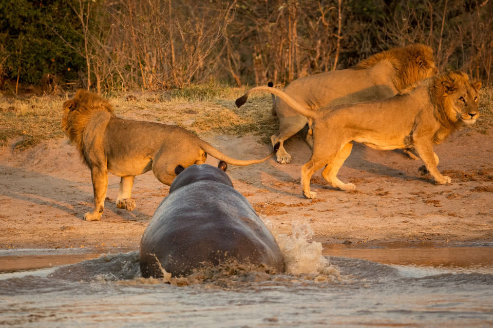 摄影师说:“狮子们来到一个小水塘里喝水。突然河马从水里冲出来,把狮子赶了出去,真是太惊险了。”