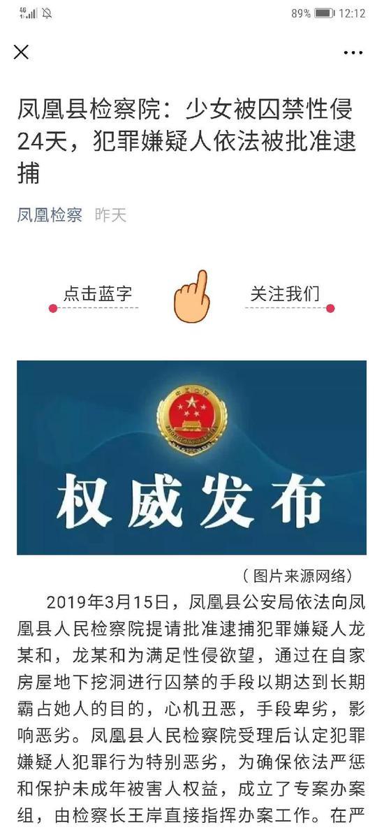 据湖南凤凰县人民检察院微信公众号3月25日消息,2019年3月15日,凤凰县公安局依法向凤凰县人民检察院提请批准逮捕犯罪嫌疑人龙某和,龙某和为满足性侵欲望,通过在自家房屋地下挖洞进行囚禁的手段以期达到长期霸占她人的目的,心机丑恶,手段卑劣,影响恶劣。凤凰县人民检察院受理后认定犯罪嫌疑人犯罪行为特别恶劣,为确保依法严惩和保护未成年被害人权益,成立了专案办案组,由检察长王岸直接指挥办案工作。在严格审查证据后,凤凰县检察院依法对其作出批准逮捕决定,并就下一步补强证据发出检察意见书。