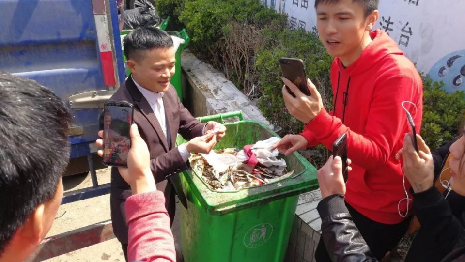 看到“马云”来了,主播们开始起哄,拥着“马云”向一堆垃圾走去,叫他现场操作垃圾分类。