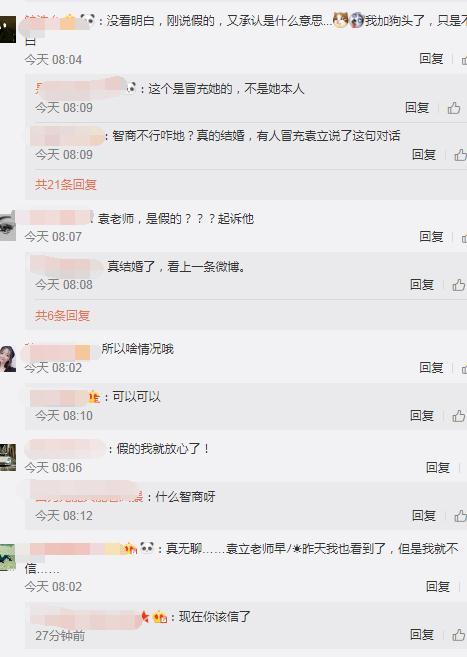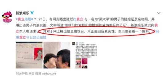网友们理解不了袁立想要表达的意思,置顶的一条微博公开了婚讯,可是截图又是否真实的呢?在这里,小编可以当一下课代表,这张截图有可能是袁立老公P的。