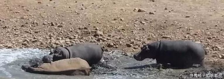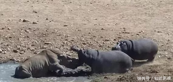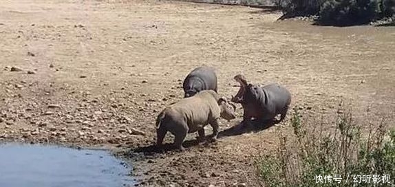 犀牛和河马各具有优势,在水里靠近水源地方,更有利于发挥河马的战斗力,而在陆地上,犀牛的冲撞撞击能力更强,只是这一次,这头犀牛想不到河马以多欺负少,猎杀性那么凶猛,即使在地面上,这头犀牛都难敌两头河马攻击。
