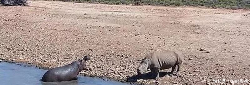 和河马为了争夺水源发生战斗,刚开始犀牛来到河边,只见一头河马在河里怒吼,警告犀牛不要靠近,尽管河马的大嘴巴可张开90度角大,嘴里还有獠牙,但犀牛一点都不畏惧,论单挑,一头犀牛对战河马还是占据上风的,所以这头犀牛不管河马的警告,靠近河边喝水。