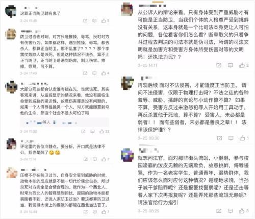 徐昕则认为,在李雷挑衅王浪的过程中,王浪已示好求情,但李雷仍多次举啤酒瓶欲殴打,并已明显具有攻击王浪颈部等行为,属于正在发生的紧迫的不法侵害。在徐昕看来,王浪此时采取的措施完全符合正当防卫。