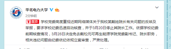 就有网友反映华北电力大学再生能源学院院长戴某涉性侵一事,3月28日下午,该校校纪委办公室监察处一名工作人员对澎湃新闻(www.thepaper.cn)回应称,已了解到网上相关舆情。