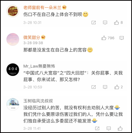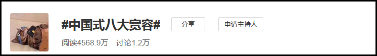 就在28日上午,一则微博话题#中国式八大宽容#在网络上引起了人们的热议: