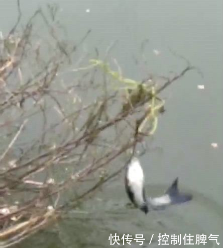 [分享]大鱼跳出水面,吃树上虫子,却被树杈钩住,吊在半空,罕见