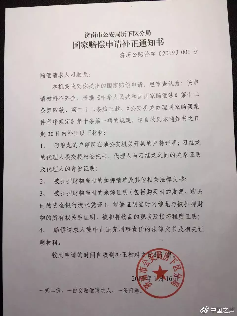 今年1月16日,济南市公安局历下分局向刁继龙发来一份补正通知,其中要求他补充多项材料,包括户籍证明、扣押清单、被扣押物品的来源证明、能够证明刁继龙与被扣押物品之间关系的证据、被扣押物品的现状以及损毁程度等等。刁继龙说:“让我开证明,证明我本人。再一个就证明当年扣押财产是你的。你已经过去已经证明了这个东西是我的,你才扣的。你怎么现在翻过头来再让我证明东西是我的,那不成开玩笑了吗?”