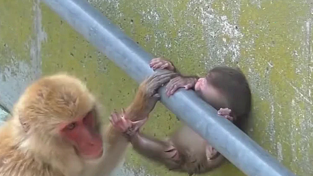 就这样僵持了将近10分钟后,小猴子的气力越来越微弱,这个时候猴妈妈才伸手抱起了小猴子,解救它于危难之中,直到这个时候众人才明白猴妈妈的良苦用心,原来它不是不心疼小猴子,而是想给小猴子一个难忘的教训而已。