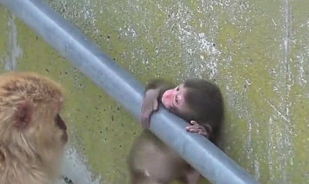 动物园中一只小猴子在玩耍的时候一脚踏空,不小心被卡在了水管和墙壁的缝隙中,比较尴尬的是小猴子头被卡在了水管中间,不过脑袋以下是可以自由活动的。