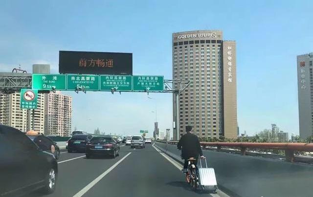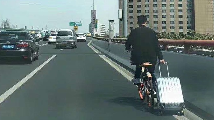 [分享]男子骑单车上高架竟还拖拉杆箱