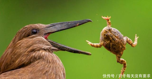 图中,一只小蟾蜍被一只锤头鹳逮到,随后这只锤头鹳玩性大发,不停地将小蟾蜍无情的抛入高空当球玩,最后把小蟾蜍一口吃掉。