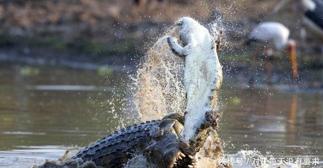 在这个意识以外、不依赖意识而存在的自然界里,物种之间及生物内部之间既展示了相互依赖的一面,又显露出弱肉强食的残酷一面。动物之间为了生存,都会不惜一切地去做斗争。图中的两只鳄鱼为了争食,不断疯狂撕咬着对方,不时在水里激起了巨大的浪花,可见同类之间在必要时刻也是毫无情分可言的。