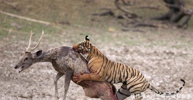 一只在野外觅食的雄鹿被一只潜伏已久的老虎逮到,老虎猛地扑上雄鹿身上,并将雄鹿摁倒在地。不停地撕咬着雄鹿,最后就这样沦为了老虎的晚餐。