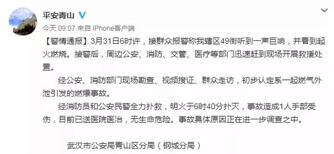 3月31日9时,武汉市公安局青山区分局官方微博@平安青山 发布通报称,辖区内听到一声巨响并起火燃烧,事故造成1人手部受伤,初步认定系一起燃气外泄引发的燃爆事故。