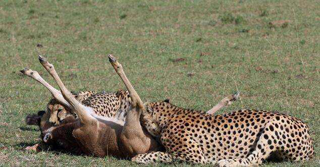 就在这时,一只不甘心的猎豹也折了回来,一齐扑向小牛羚,远处一只过路的豺也停下来等着舔根骨头。