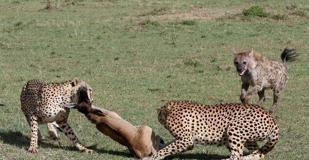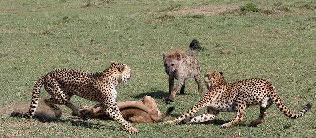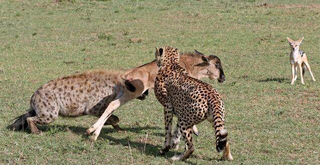当一头落单小牛羚遇上猎豹再来一只非洲二哥鬣狗分食?小命难保只能等着被分尸?嗯,这是一般牛羚的命运,但对于一只开挂的小牛羚,这可是逃命的大好时机!肯尼亚马赛马拉国家野生动物保护区一头牛羚幼崽被两只猎豹盯上,两家伙将小牛羚按倒在地,张口就要开吃。