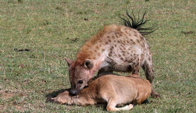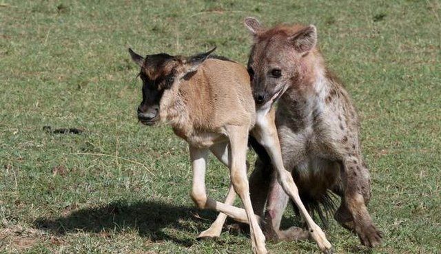非洲二哥鬣狗没想到猎豹这么容易就让出了整只猎物,它美滋滋地走向可怜的小牛羚,心想这下可以独享大餐了。