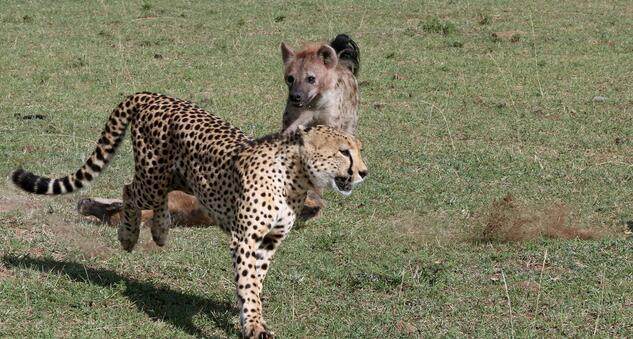 非洲二哥鬣狗来势汹汹一上来就对着猎豹狂吠,两只猎豹瞬间没了底气,一见非洲二哥鬣狗靠近便拔腿就跑,到嘴的小肥牛也不要了。