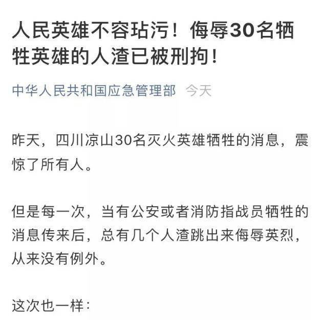 4月2日深夜,应急管理部官微罕见发文怒斥“人渣”,“人民英雄不容玷污!侮辱30名牺牲英雄的人渣已被刑拘!”文章标题语气异常严厉。