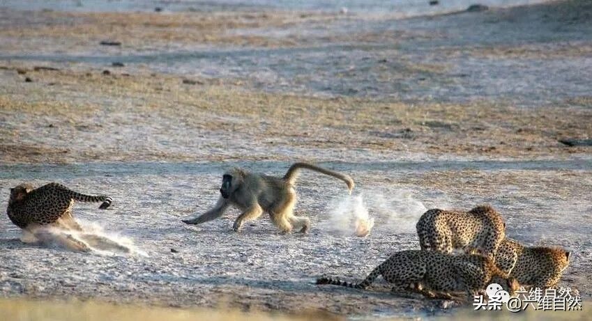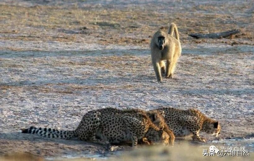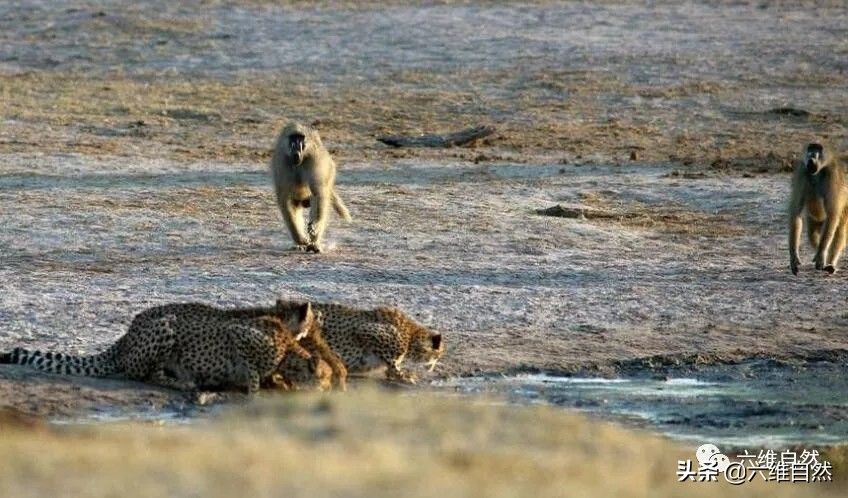 其它猎豹都只顾喝水,根本就不过来帮忙,也许群体中默认了它们这是一种单挑行为,狒狒要和猎豹单挑,成年公狒狒战斗力可不弱,而猎豹是猫科动物里战斗力最差的,而且还是一窝刚长大的亚成年猎豹,最终是猎豹认怂,转身就逃。(关注六维自然顺其自然认识自然!)