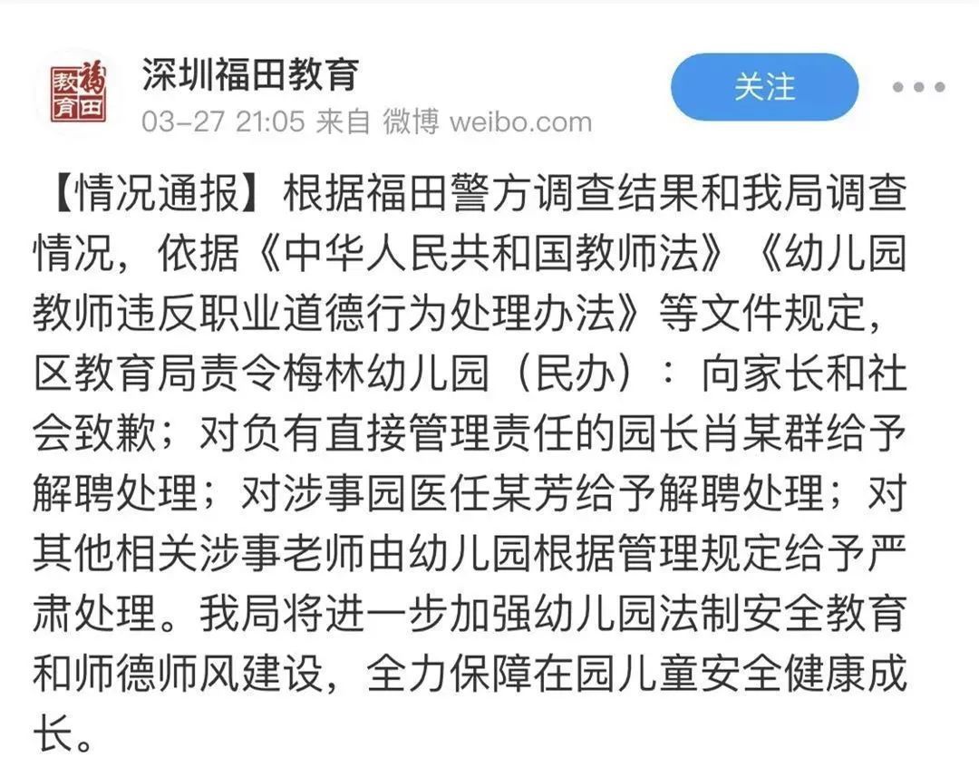 福田区教育局通过其官方微博账号发布通报称,责令该幼儿园向家长及社会致歉,对园长及园医给予解聘处理,对其他涉事老师给予严肃处理。