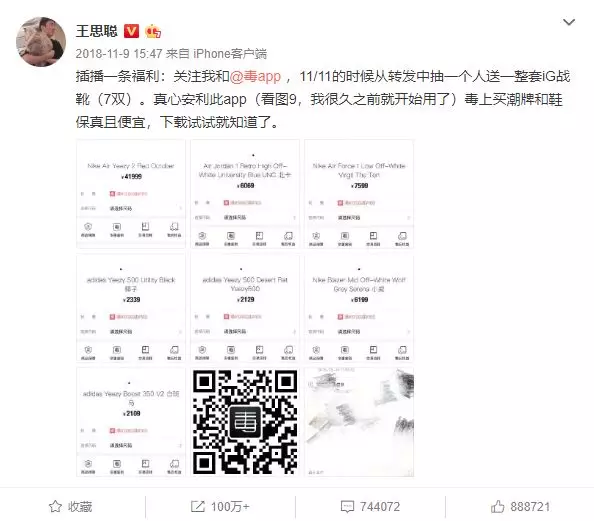 事情到这里并未结束。11月9日,王思聪在微博“插播了一条福利”,称关注他与潮品交易平台“毒app”的官博并转发,有可能在11月11日开奖的同时,获得一整套iG战靴;之后更是直言安利该APP,称是“自己本来在用的东西”,不算打广告。