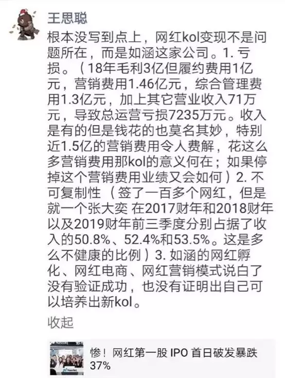 根据昨日晚间一张网传截图,王思聪在朋友圈转发某媒体报道时指出,如涵所存在的三大问题包括:首先是因营销费用占比过高等所造成的亏损、其次则是因为网红具有不可复制性;最重要的是如涵的模式“说白了没有验证成功,也没有证明出自己可以培养出新kol”。