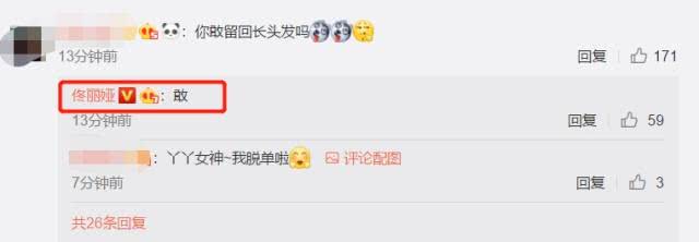 虽然佟丽娅没有晒出全脸照,但粉丝们依然像过节一样开心,有网友表示看到丫丫重新留长发是自己的梦想,而现在梦想马上要成真了。还有粉丝直接给佟丽娅留言:“你敢留回长发吗”,对于这种“挑衅”般的质疑,佟丽娅回应道:“敢!”是霸气十足的狮子座女孩无疑了。