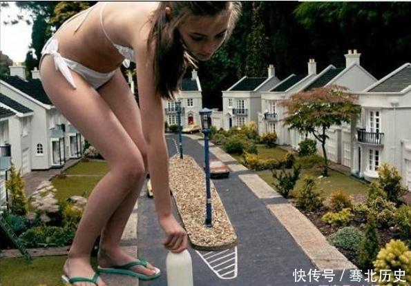 美女在一个社区中,弯腰捡一瓶牛奶,身边的汽车道路还有社区跟她想必可以说是十分的小的,像是到了小人国中,但是这也是一种摄影的手段,除了少女是真的之外,其他的东西都是模型,其实我们小的时候看的奥特曼电影就是这样拍摄的。
