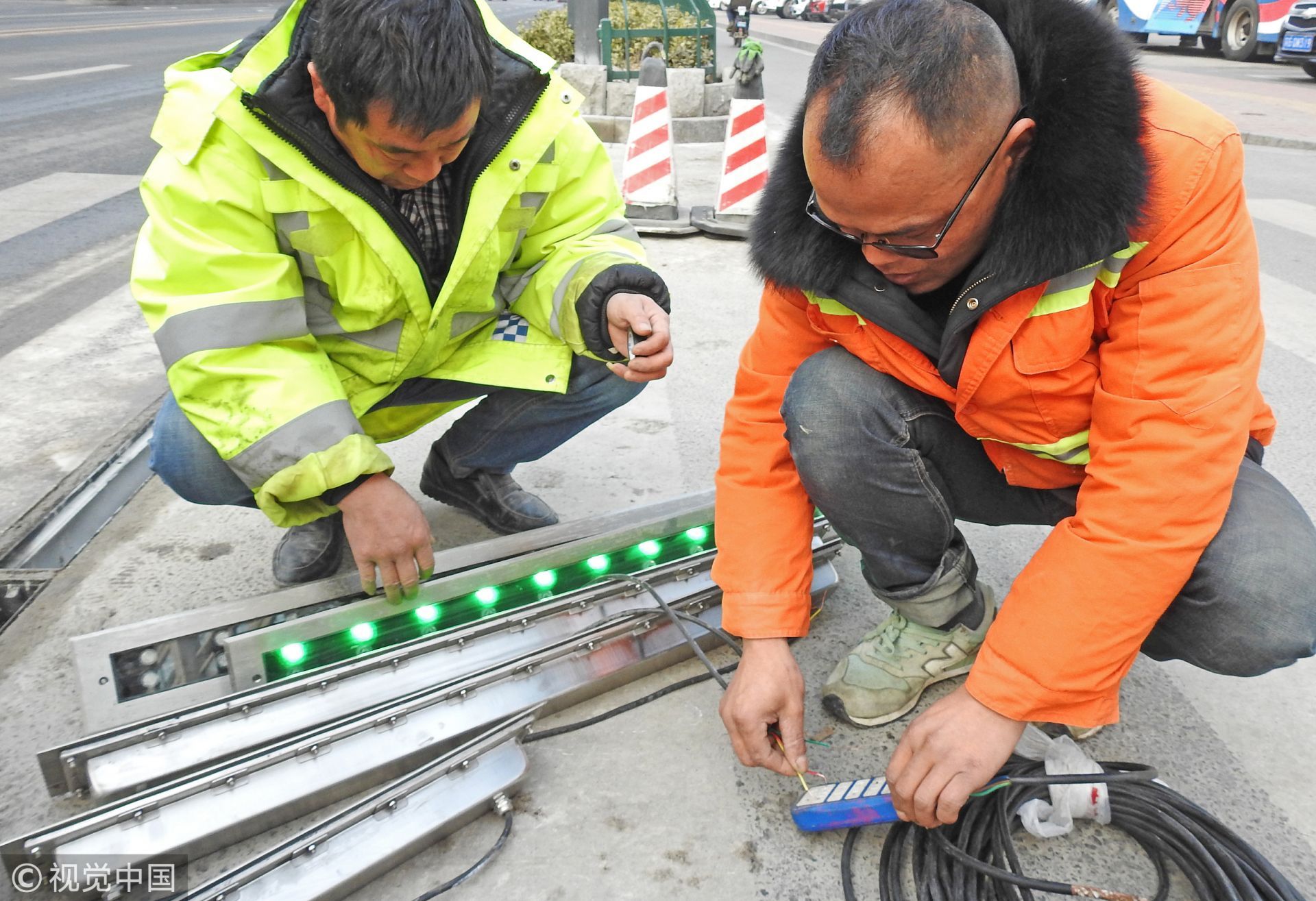 江苏连云港,工人正在安装和调试地埋式智能斑马线系统