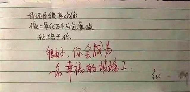 这是一封化学情书,“我还是很喜欢你,像二氧化哇与氨氧酸独溶于你”,不得不说这位同学真的是很专情啊,不过老师的评论也是让人眼前一亮,老师倒是直言了反应的结果,直接在下面写下你会成为一名幸福的玻璃工,这封情书虽然看起来挺浪漫的,但是和现实生活中差着十万八千里呀,但是这位同学的真心和感慨还是很令人佩服的。