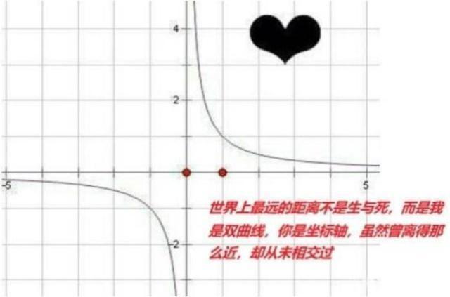这是一个数学学霸,他利用双曲线写出了一份浪漫无比的情书,表达了自己的相思之情。世界上最远的距离不是生与死,而是我是双曲线,你是坐标轴,看着那么近,却从来都没有相交过!根据双曲线的原理他们还不如牛郎织女,牛郎织女每年还可以鹊桥相会,而这个双曲线与坐标轴虽然可以无限接近,但却永远也不能相交。