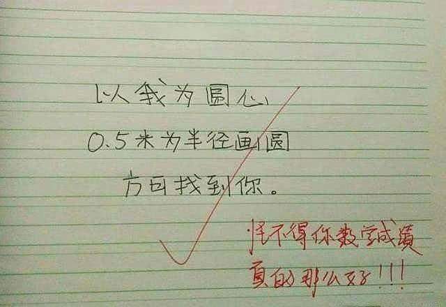 学霸的情书,都是用学科知识写成的,这封以数学知识写的情书可以说是非常不错的,它的内容是“以我为圆心,0.5米为半径画圆,方可找到你”,可以说字字都是满满的套路。最后连老师都是忍不住要写上一句,“怪不得你数学成绩真的那么好”。这就是学霸的魅力,不仅把数学知识学好了,恋情书都是写的别出心裁,可以说比普通的情书好多了。