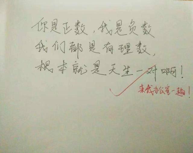 数学学霸独出心裁地写出这样的情书:你是正数,我是负数,我们都是有理数,根本就是天生一对呀!数学在大多数人看来枯燥无味,数学学霸总是给人一种呆板高冷的形象,没想到能写出这样的情书,实在是令人很是动容,大大地打破了人们对于理工男的固有形象。