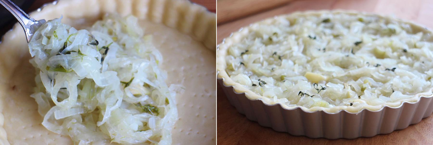 方形这个因为塔皮较厚又是玻璃皿,所以有先放进烤箱底层烤5分钟再拿出来填馅,多了这个步骤,料虽放得很多,饼皮底部上色均匀,烤得又透又脆。洋葱馅自然的甘甜有如加了蜜糖一般,很难想像只用了盐巴调味,绵密湿软的内馅搭上薄脆的饼皮,这绝妙的组合真的太令人惊艳了!!
