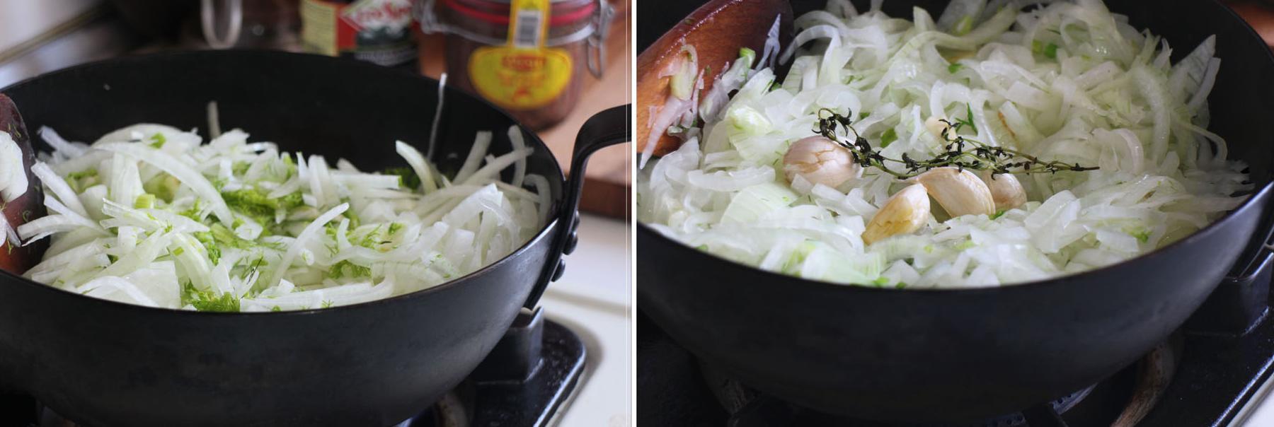 制作前来回读了好多次姐姐的试作文,炒洋葱攸关成败,特地用计时器定了时间,我惯用黑鼎铁锅,温度很高一个不小心就会过头,所以不时的调整火力,先炒洋葱和茴香10分钟,之后放入蒜头、百里香和月桂叶再炒15分钟,小心的不让洋葱炒上色~。