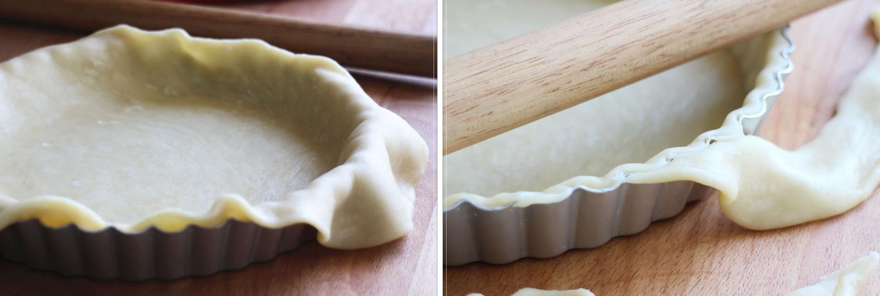 将面团分成两份,杆成0.3公分的薄皮放入派盘中,橄面棍在派盘上缘碾压过,可轻易的切掉多余的塔皮。