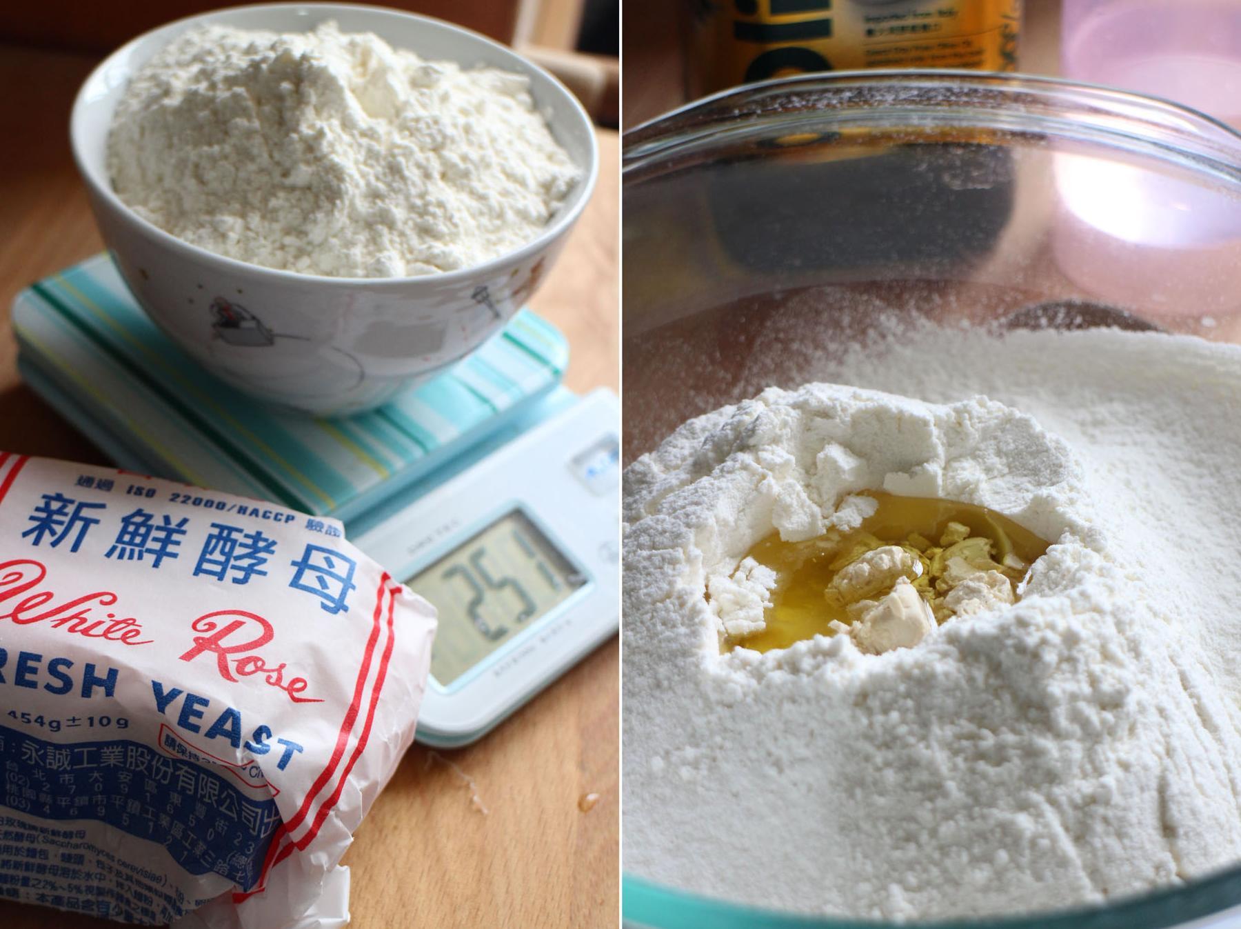 派皮用中筋面粉、新鲜酵母和橄榄油,没使用一般派皮常用的奶油,想必会是个清爽不油腻的派皮,面粉过筛后加入盐、新鲜酵母和橄榄油,一面搅扮一面加入温水,依以往的经验水要慢慢加让面粉有时间吸收,我的加到80ml是刚好的湿度,后面的20ml就可以不要再加了!