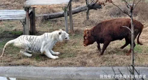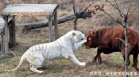 大千世界无奇不有!在一家动物园里,一头白虎生下来就在里边,在人工饲养中,它渐渐地失去了王者之风,饲养员为了锻炼白虎的野性,于是就丢给它一头牛,想看看白虎是怎么制服这头牛的。当牛遇到了白虎之后,顿时快吓坏了,而白虎却从来没有见过这种体型比自己还大的动物,心里有点懵懵的。