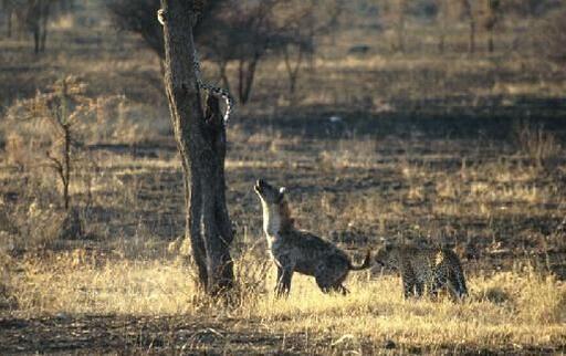 斑鬣狗PK花豹,一只花豹吓的上树了 ……