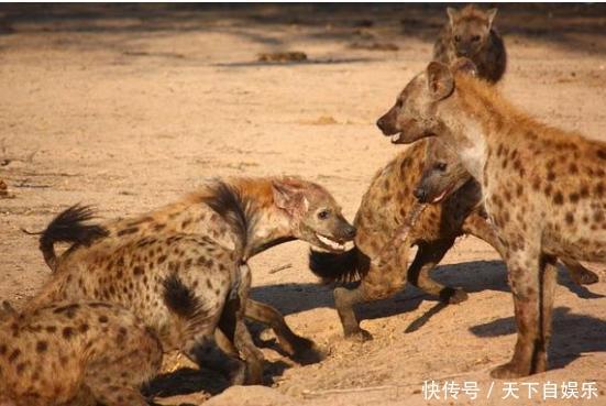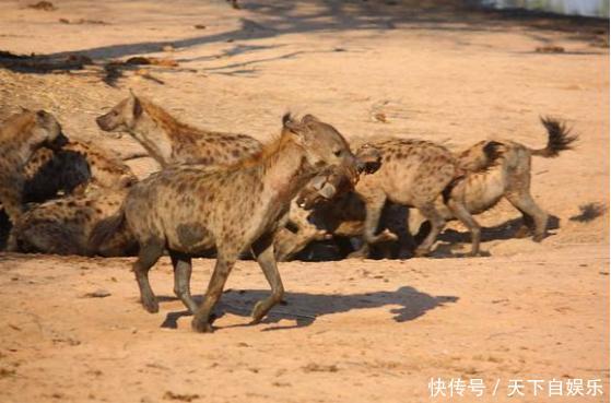 雄狮看到眼前10只鬣狗,深知自己不懂对手,为了护肛,一块残骸算什么,于是低头看看,迅速逃离了!