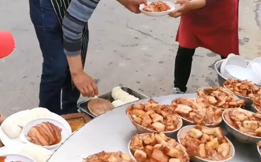 在门口交了200元的份子钱后,小白就直接来到了后厨,所谓的后厨其实只是临时在空地上搭建起来的。远远的就闻到了一股浓郁的肉香味道,只见主人家在空地上架起了10口大锅,里面不停的冒着热气,这种锅的尺寸也是很大的,小白估计有1.5米左右。