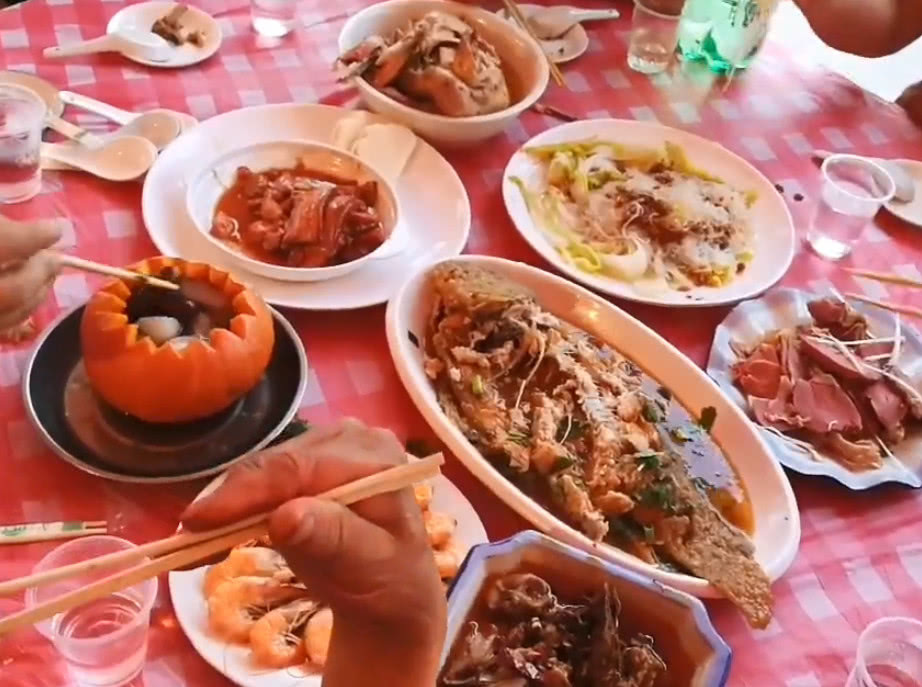 小白看完后,就直接找了个座位入座了。不到20分钟的时间,就开始上菜了,很快桌上就放满了美食。虽然只有12道,不过也是很丰盛了。像红烧鱼,烤制的烧鸡,凉拌牛肉之类的,还有一个很有特色海鲜南瓜煲,不过看到这么多美食的食材,小白却是吃不下了。