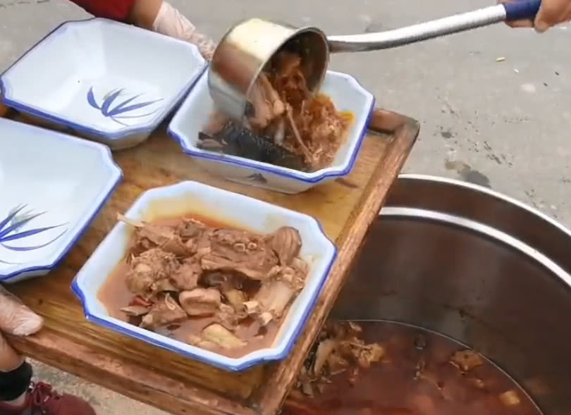 在大锅的边上,就站着一位大厨,拿着比脸还大的勺子在不停的翻煮着。等食材烹煮完成后,就有好多大妈端着盆子来盛放美食了。就像图中展示的这样了,大妈正在装的这种是麻辣的炖鸡肉,除了一股浓郁的肉香味外,更多的还是辛辣的味道了。