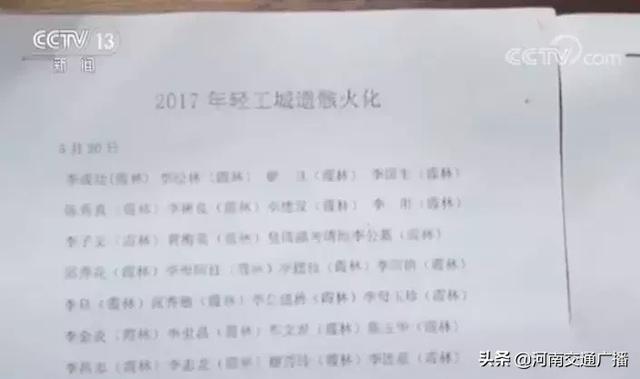 西山园殡仪馆,工作人员根据骨灰盒相关信息,找到与之相对应的,2017年霞林村轻工城遗骸火化名单和一份火化时间表,名单上不仅有李秀清的名字,还有准确的火化时间:2017年4月26日。