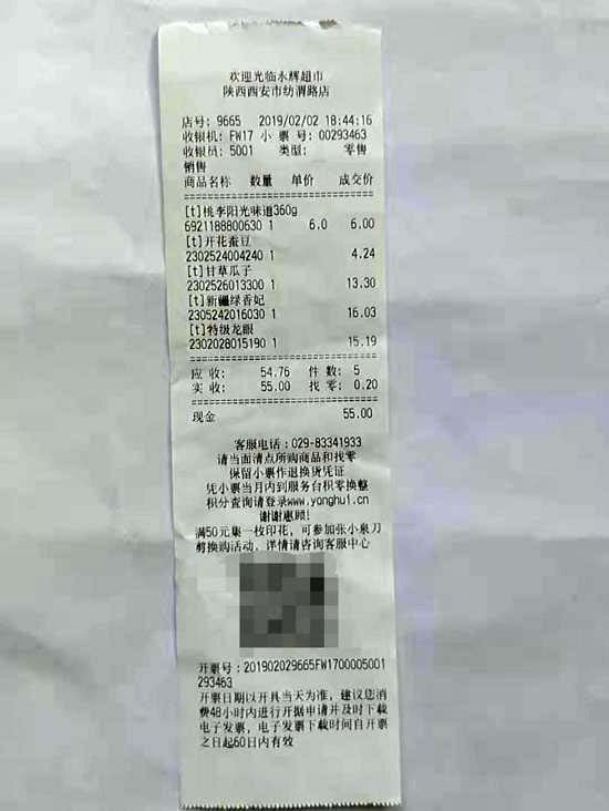 2019年2月2日,西安市民肖绵明在永辉超市(纺渭路店)购买了54.76元的商品,肖绵明付给收银员55元现金,收到2角找零。肖绵明有保留购物小票的习惯,回家后他发现,永辉超市少给他找零4分钱。