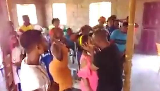 据悉,在这场布道活动中,男牧师亲吻了女孩两次。第一次“仪式”后牧师突然退后,不停地挥舞手臂,似乎在驱散恶灵,同时,女子的脑袋左右摇摆,右手在胃部划圈做手势,似乎被体内的恶魔搅得神志不清,于是男子挥动双手,大声喊出命令,然后开始了第二次接吻。第二次怪异的仪式持续了更久,教堂内围观的集会成员慢慢走上前观察牧师的亲吻,站在第一排的两个女人双手抱在脑袋上,似乎很担心这位正在进行仪式的年轻女子。