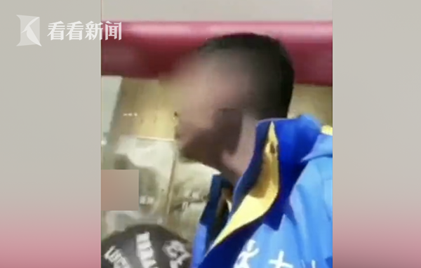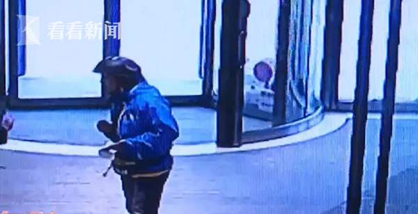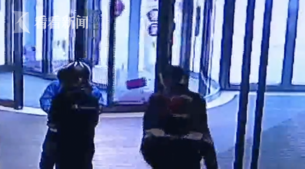 商场的监控显示,一名男子身穿快递的衣服进入商场的旋转门后,被保安人员拦下,当时男子手里拿着东西。双方交涉了一会后,男子给取件人打了电话,取件人拿走了快递。