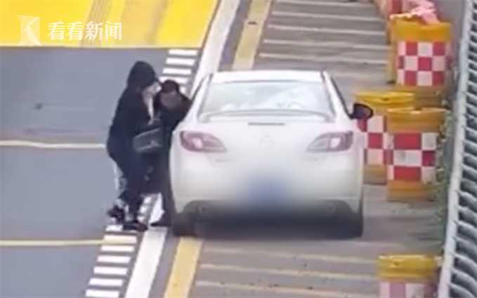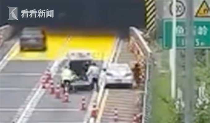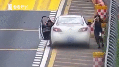 视频,通过监控视频发现往杭州方向鱼石岭隧道口的硬路肩上停着一辆白色小轿车,驾驶员打开车门时显得很费力,扶着车门摇晃着走出来,他妻子赶紧从副驾驶室出来上前扶他,结果没走两步就倒在地上。