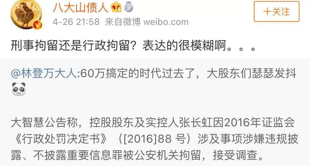 又是深夜炸雷,炒股的小伙伴都听说过大智慧吧,刚刚发布公告,实控人张长虹被公安拘留了!